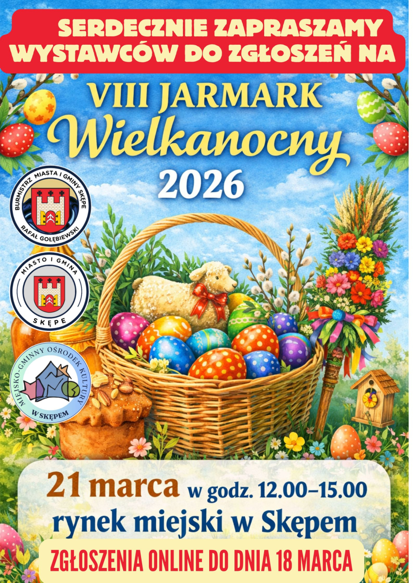 Zapraszamy na VIII Jarmark Wielkanocny w Skępem, który odbędzie się 21 marca 2026 r. na rynku miejskim w Skępem w godzinach 12:00–15:00. Organizatorem wydarzenia jest Miasto i Gmina Skępe.